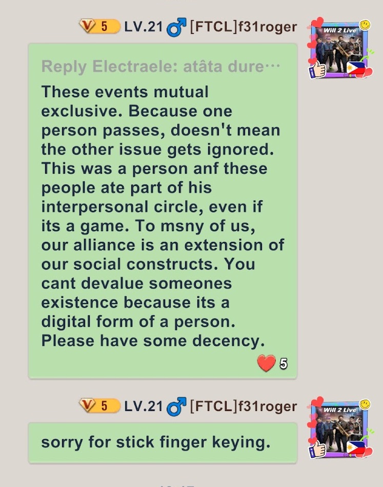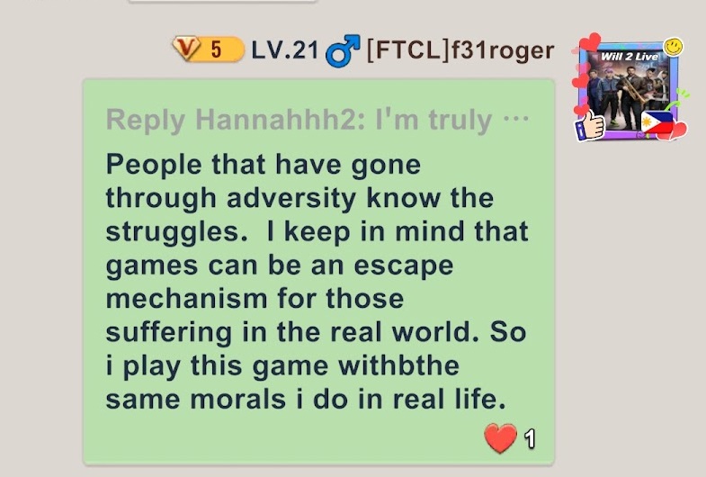 Sometimes, people say things at the wrong time or they are insensitive. One player was doing that. She was downplaying his death compared to kids starving and dying everyday…something to that affect. I had this response: