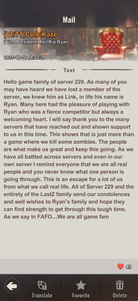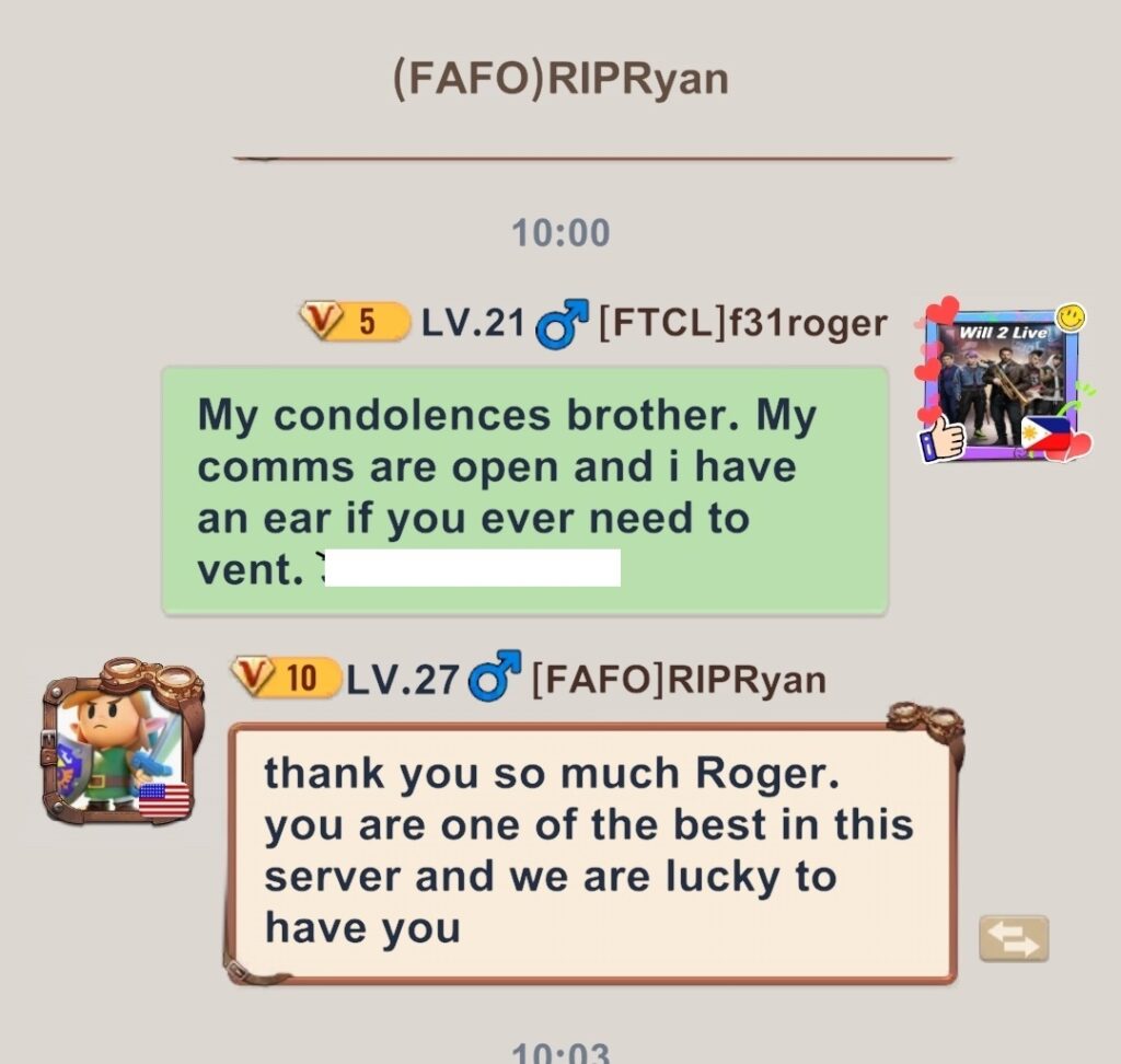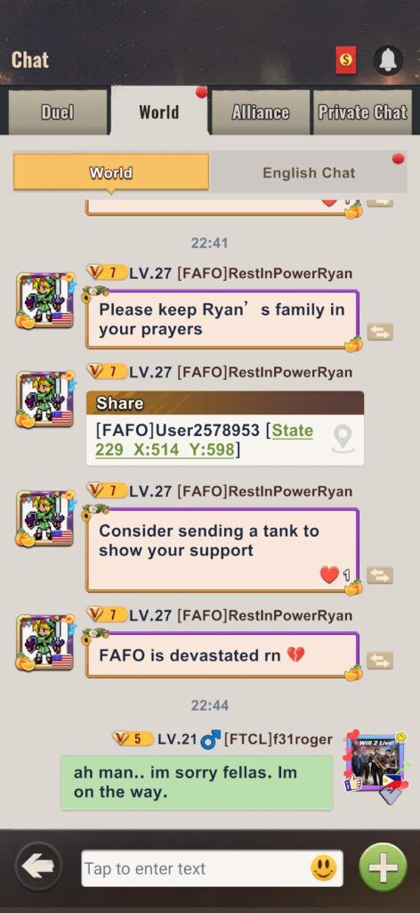 The last 2 days have been rough. One of PAD’s members lost a nephew and so we show support by sending a truck to their area. I never met this player, but I gave my condolences and later, I gave him a digital hug.