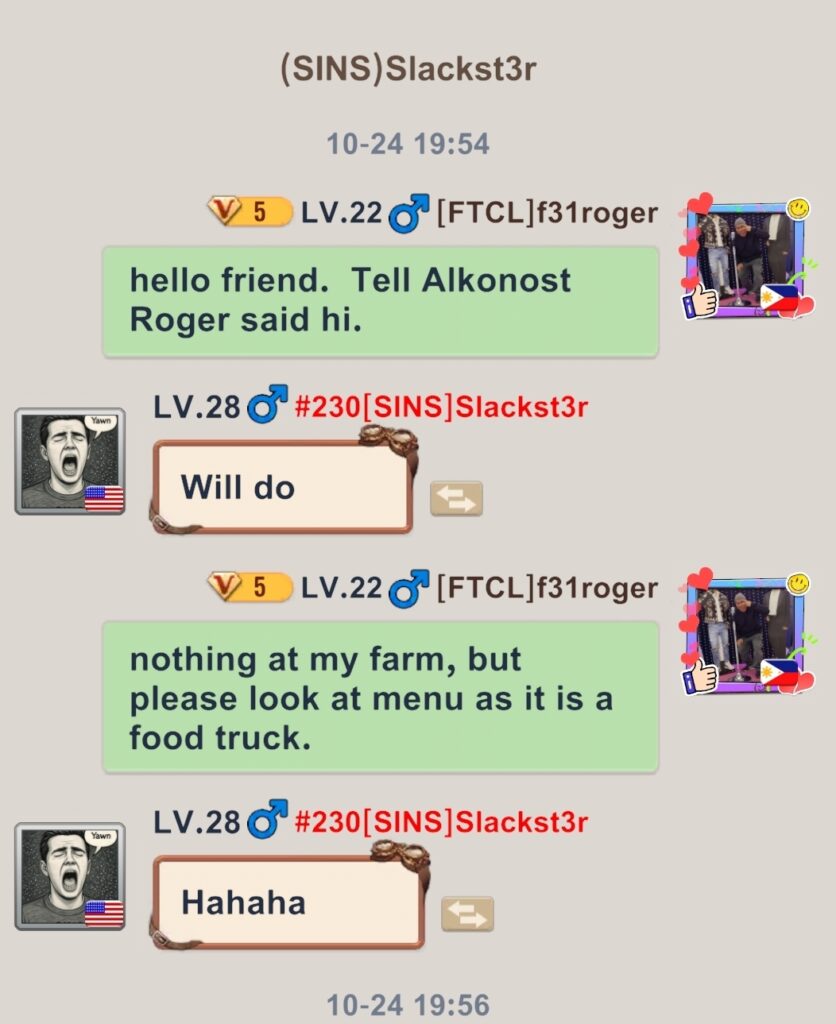 Before SvS was ending, I met with another SINS player, Gangster 37VN. He was out looting and I messaged him if Alkonost was online (she wasn’t ):