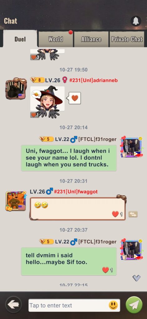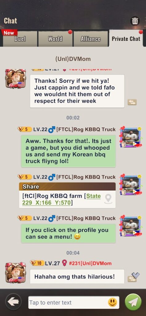 I didn’t know this, but there are 2 Uni (2 combined alliances) and one of them messaged me. As someone sent my KBBQ truck flying.