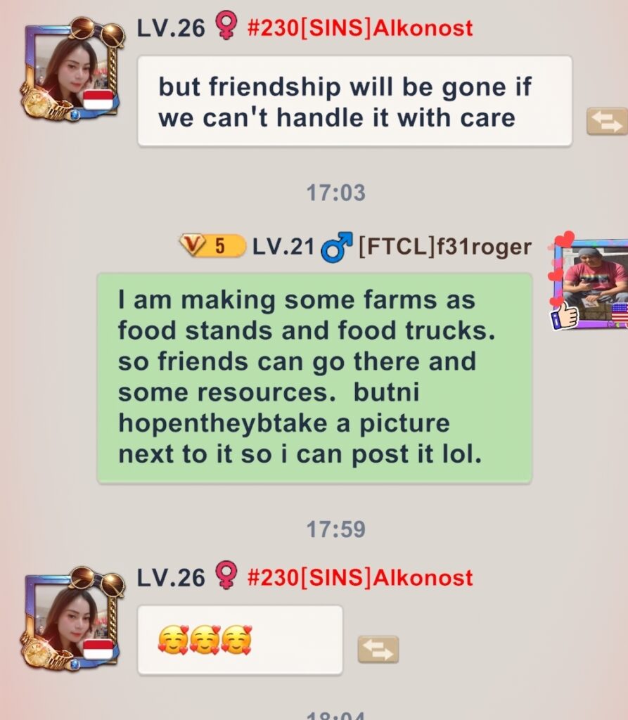 This is where I got the idea of having a farm so people could get rss from. I wanted to somehow give her some restitution, she said its okay as it was part of the game. But this stuck with me when she talked about friendship (not directed towards me, just in general).