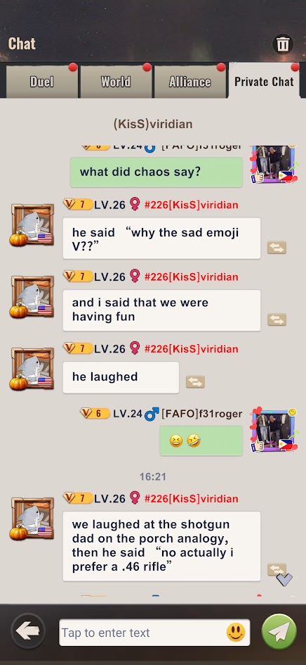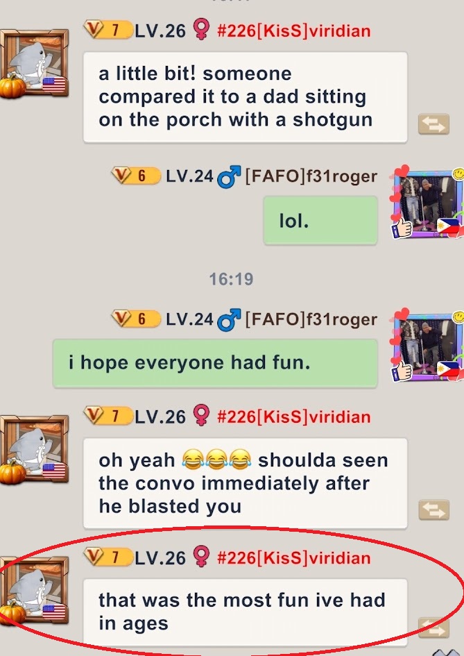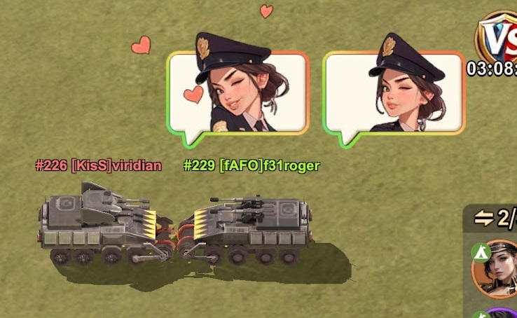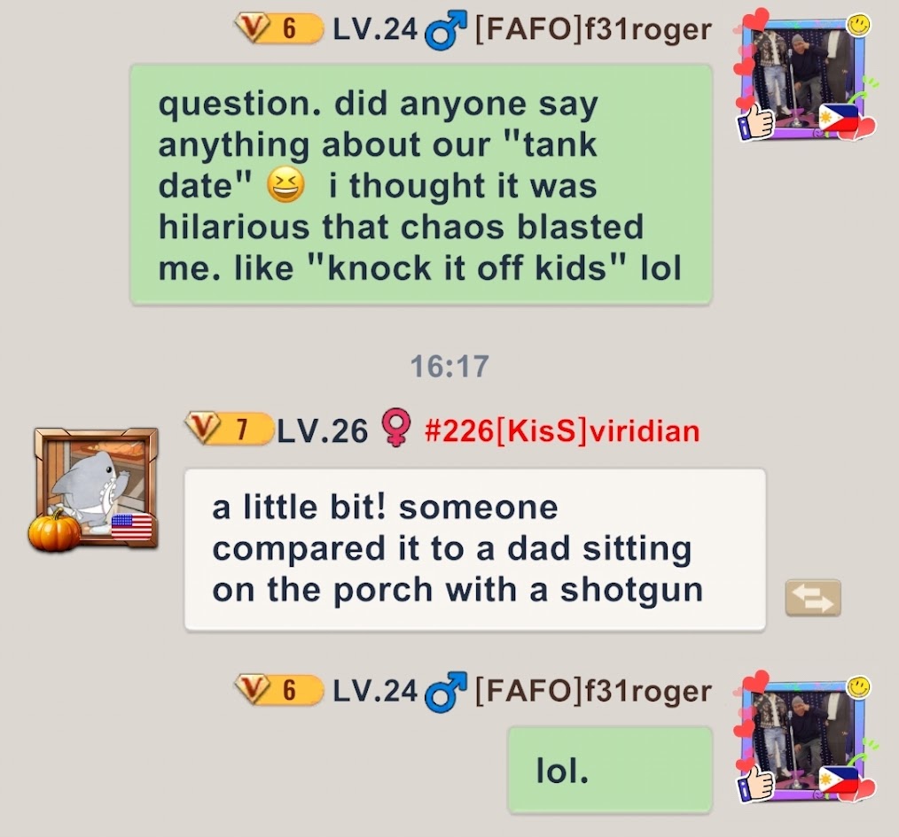I was in 226 talking with my KisS family and just having fun. I was taking pictures next to people’s bases and Viridian said she would pull out a tank and do emotes. I was trying to get close to her, but then we were face to face lol. It was just funny and we went with it.