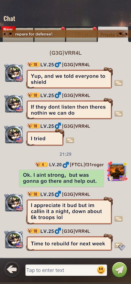 One player I really enjoy is Alko. She zeroed me in the mud when when 230 came into our capital. After that we would chat at times. I don’t know what happened, but then Nate…